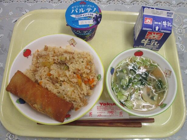 キムチご飯、変わり春巻き、中華スープ、ブルーベリーヨーグルト、牛乳