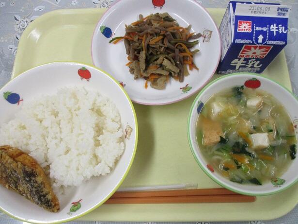ごはん、ホッケのカレー揚げ、茎わかめのきんぴら、具だくさんスープ、牛乳