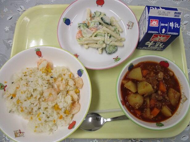 エビピラフ、チリコンカン、マカロニサラダ、牛乳