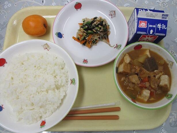 ごはん、若鶏の味噌煮、納豆和え、ビワ、牛乳