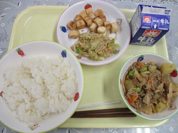 ごはん、ひき肉胡麻じゃが、ツナとキャベツ和え、麩のシナモンシュガー、牛乳