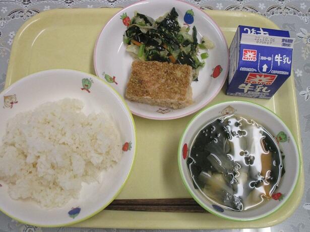 わかめごはん、鮭の生姜焼き、沢煮椀、サツマイモサラダ、りんご、牛乳