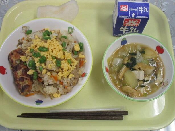 五目釜飯、ちくわの磯辺揚げ、八宝味噌汁、市川の梨、牛乳