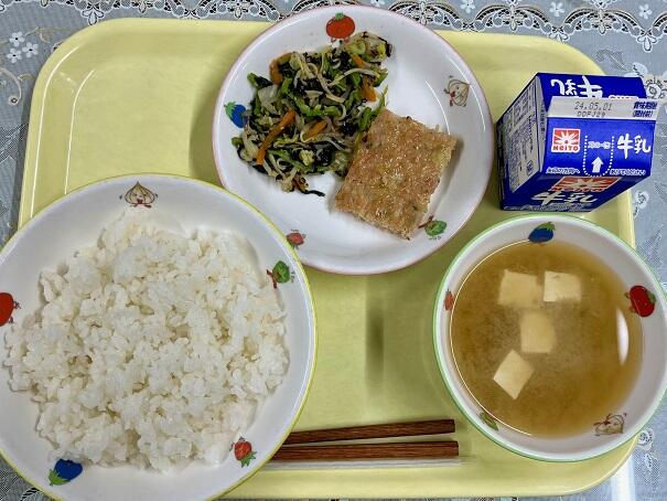 ごはん、ツナの山河焼き、味噌汁、胡麻酢和え、牛乳