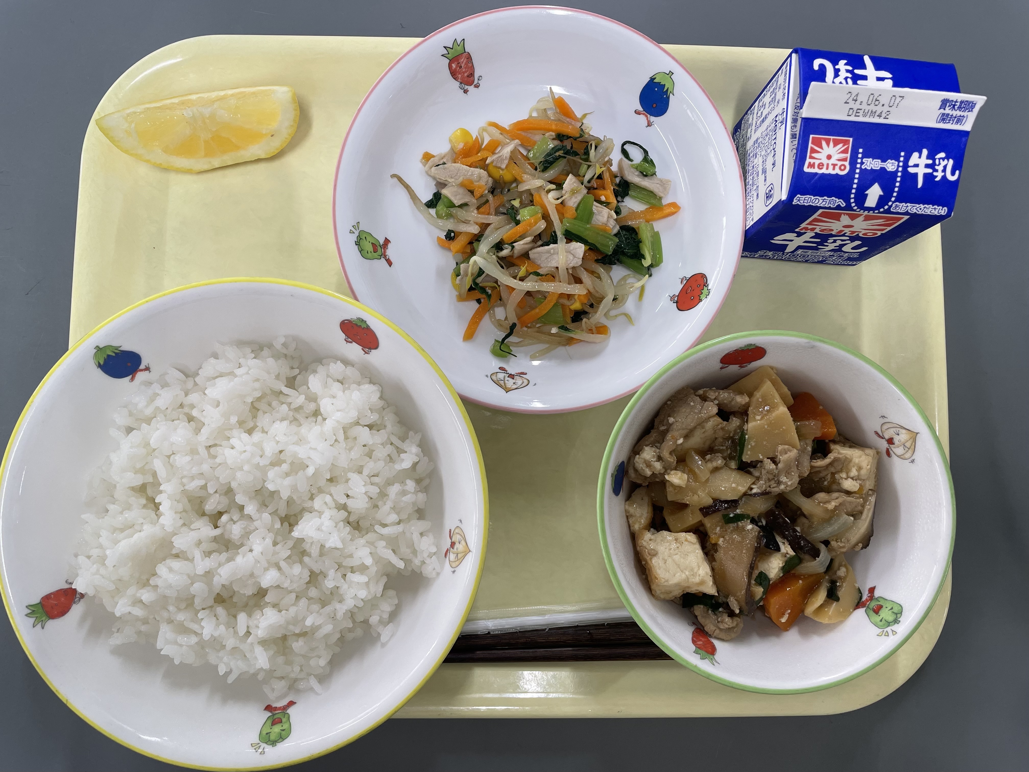 ご飯、家常豆腐(かじょうどうふ)、ナムル、小夏、牛乳