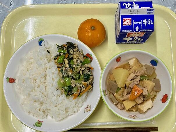 ほくほくのジャガイモや厚揚げ、たけのこ、こんにゃくなどが味噌仕立てでおいしく煮込まれています。時間が経つに従って味がどんどんしみこむと思われます。和え物は小松菜ともやし、何より刻み海苔が風味を添えています。冷凍みかんは小ぶりですが、程よい酸味と甘さを感じます。
