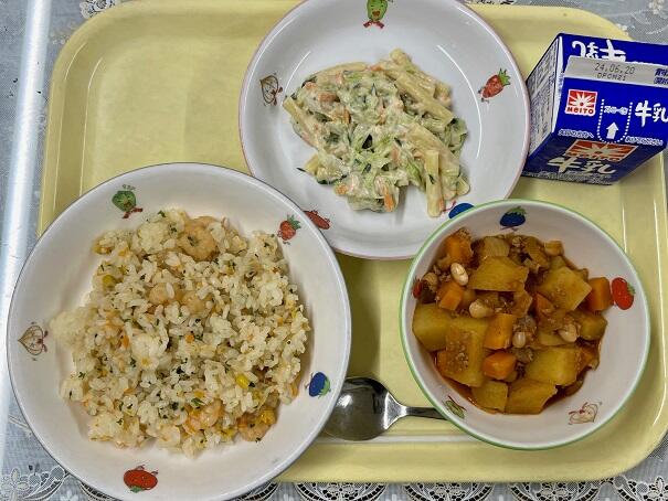エビピラフ、チリコンカン、マカロニサラダ、牛乳
