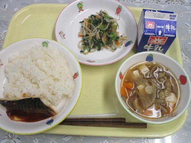 ごはん、サバの味噌煮、けんちん汁、ツナの和え物、牛乳