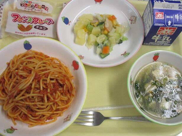 スパゲッティボロネーゼ、チンゲン菜のスープ、マセドアンサラダ、チョコクレープ、牛乳