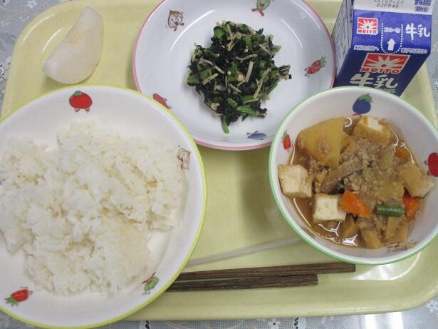ごはん、生揚げの肉味噌煮、磯香和え、市川の梨、牛乳