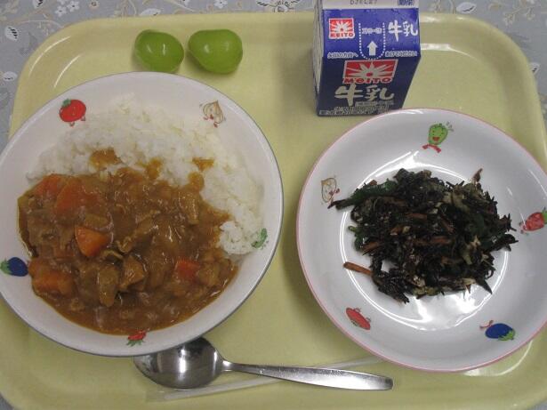 ポークカレー、ひじきのマリネ、ぶどう、牛乳