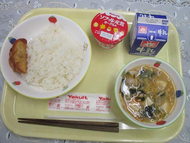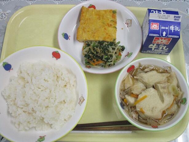 ごはん、擬製豆腐、せんべい汁、小松菜のごま和え、牛乳