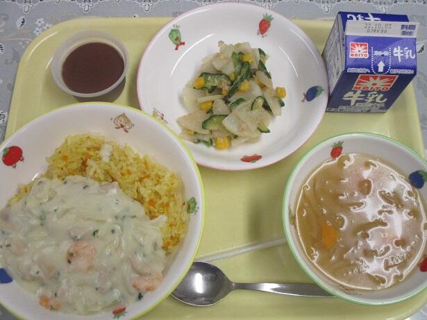 ドリア風カレーピラフ、オニオンスープ、蕪のサラダ、ココアゼリー、牛乳