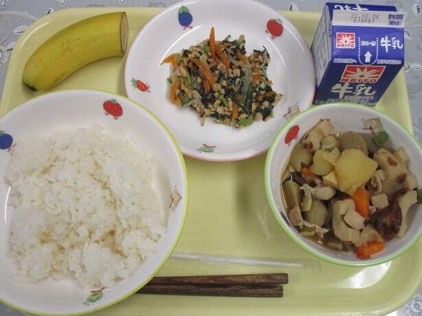 ごはん、炒り鶏煮、納豆和え、バナナ、牛乳