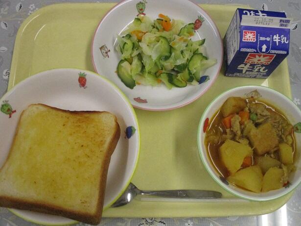 インド煮はスパイス香る美味しさで、ウズラの卵がうれしいもの。5時間目までウズラの卵を噛まずに大事にとっておいて、真っ白になった卵を見せてくれる子が担任したクラスにいたものです。ハニートーストは、適度な甘さがいい。サラダもスッキリした味付けです。