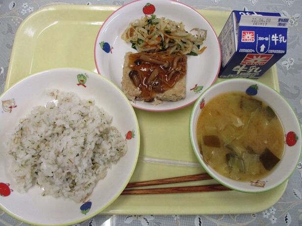 青のりごはん、味噌汁、豆腐バーグ、もやし和え、牛乳