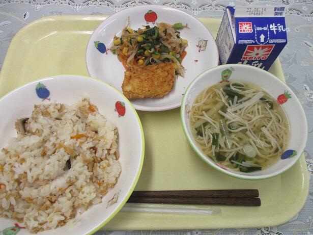 いなりごはん、すまし汁、イカのかりん揚げ、おかか和え、牛乳