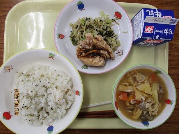 菜飯、田舎汁、鶏肉のレモン煮、磯和え、牛乳