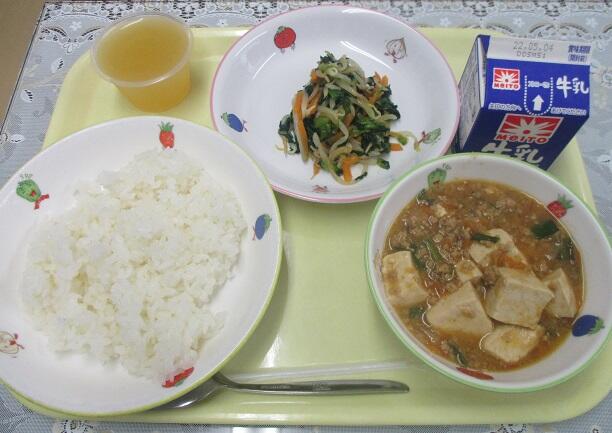 ごはん、麻婆豆腐、ナムル、りんごゼリー、牛乳