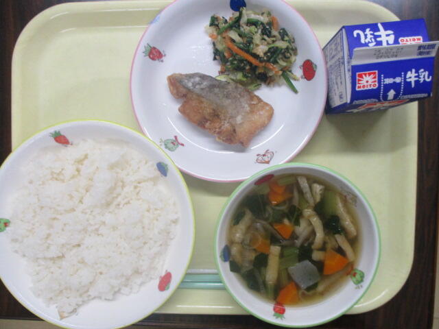 「いなだ」は出世魚で、40cmくらいの大きさの魚です。(1m以上になると「ぶり」とよびます)竜田揚げ、サクサク、カリッとしていて美味しく、ご飯が進みます。ごま和えは、ごまと砂糖の甘味がほどよいです。けんちん汁、あっさりとした汁に、鶏肉とたくさんの野菜をいっぺんにとることができます。