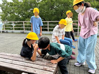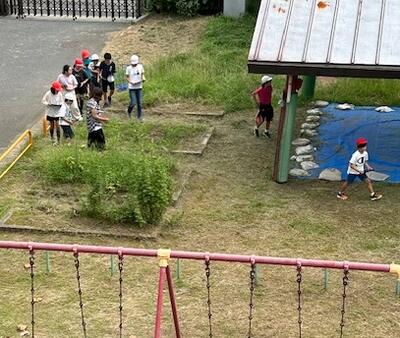 4年生が理科の学習で、「夏の終わりを見つけよう」とタブレット端末を持ち出して、植物や昆虫などを写して記録しています。授業が終わって教室へ戻るときには先生も被写体に…。私も「夏の終わり」ですかぁ?