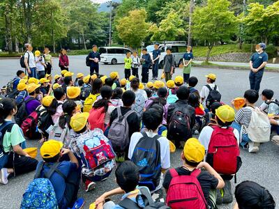 16:50 源泉を見学して宿へ向かう途中シカの群れがいます。そして、バスターミナルで入館式を行いました。