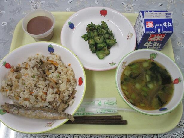 豚肉とごぼうのまぜご飯、ししゃもの唐揚げ、田舎汁、きゅうりの土佐和え、ココアゼリー、牛乳