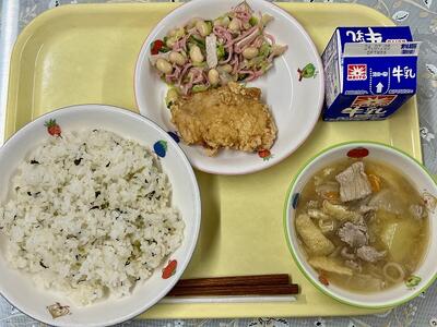 菜飯、鶏の唐揚げ、大豆とハムのサラダ、田舎汁、牛乳