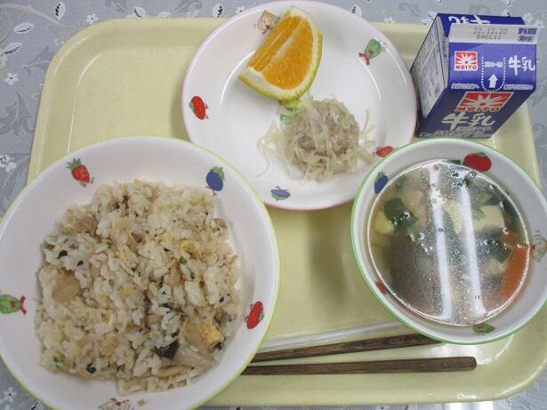 中華きのこご飯、花シュウマイ、青梗菜のスープ、スイートスプリング、牛乳