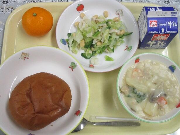 黒糖パン、冬野菜のクリーム煮、大豆とハムのサラダ、みかん、牛乳