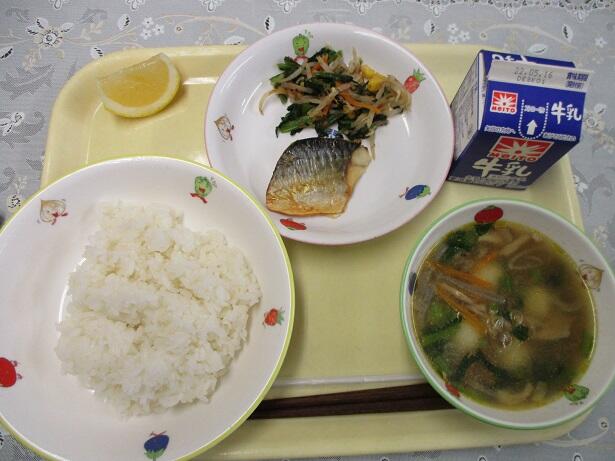 ごはん、鯖の文化干し、だまこ汁、おかか和え、小夏、牛乳