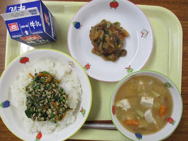 ご飯、蓮の和風ハンバーグ、みそ汁、納豆和え、牛乳