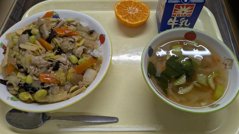 中華丼 チンゲン菜のスープ みかん 牛乳