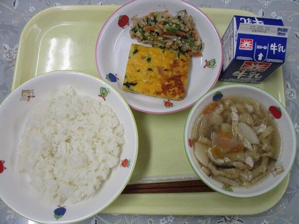 ごはん、千草焼き、のっぺい汁、納豆和え、牛乳