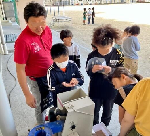 お米マイスターの先生を招いて、クラスごとに機械で籾摺りをしたあとにお話を聞きました。田植えからここまでの経験をふまえて、来年度5年生に伝え、マイスターとともに指導・助言するのも学びを生かすことになります。