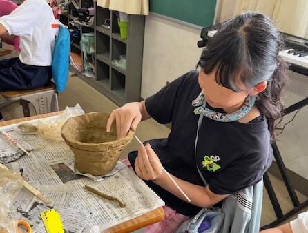6年生の歴史学習が始まって、図工でも土器づくりです。テラコッタ粘土をイメージした形にしていきますが、なかなか手ごわい!業者の方にもご指導いただき、取っ手をつけたり模様をつけたり…。十分乾燥させた後、素焼きしてもらったものが手元に返ってきます。