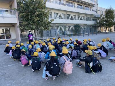 風は少し冷たいですが、快晴でよかったです。出発式をして、校外学習のスタートです。