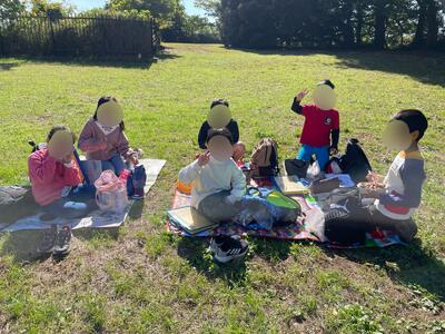 待ちに待ったお弁当タイムです。風が少し冷たいですが、日向を選んで、芝生の広場でお弁当を食べました。体調が悪い子は一人もいません。午後に向けて、パワーチャージ!