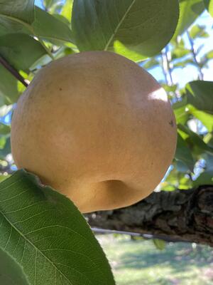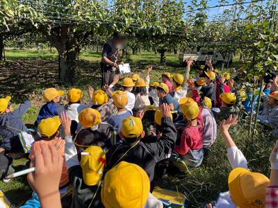 梨農家さんからは、一つの木から300個程度梨ができることなどを教えてもらいました。梨の時期は過ぎていますが、奇跡の梨を発見!予定通り梨園を出発し、学校に戻ります。