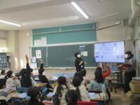 平田小学校の校舎内の教室配置図を大型提示装置で確認しながら、どの教室かを考え、発表し、その場所について英語での呼び方を皆で発音していました。