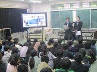 5校時にマルチルームで、八中生徒会の生徒3名が本校に来て、中学校のことについて説明をしてくれました。中学校の一日、時程、委員会、部活動などについて、プレゼンテーションソフトも使いながら、身振り、手ぶりを入れて、明るくわかりやすく話してくれました。最初は少し緊張気味の6年生でしたが、八中生が途中インタビューを入れたり、質問に快く答えてくれたりして、途中からたくさんの児童が質問をしていました。中学生と対面し、中学校について具体的なイメージがもてる貴重な機会となりました。