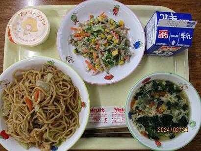 焼きそば、中華風コーンスープ、ごぼうサラダ、マンゴープリン、牛乳