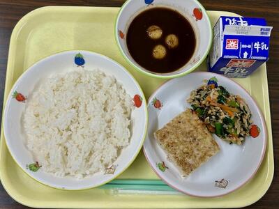 ごはん、松風焼き、納豆和え、白玉小豆、牛乳