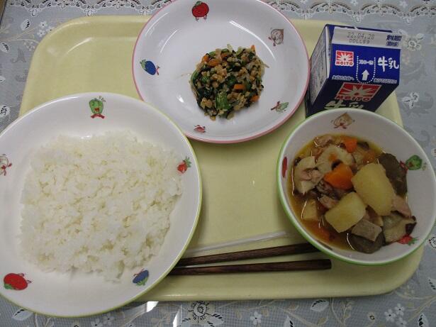 ごはん、炒り鶏煮、納豆和え、牛乳