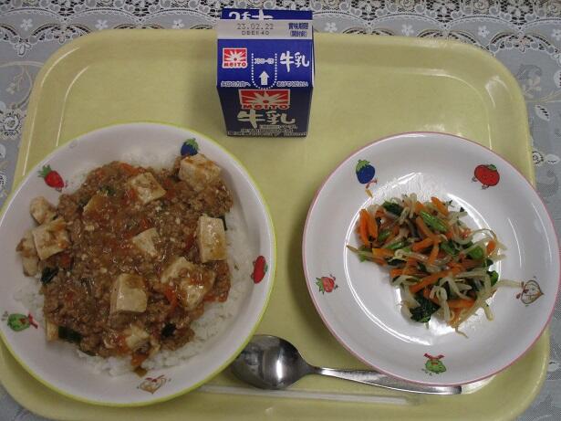 トレイの上が少し寂しいけれど、中学年の熱量は約600kcalですから標準です。ナムルはいつもながら野菜の味を上手に引き出すように薄味。ごま油も適量です。そのあと口に入れる麻婆豆腐は、とろみが丁度よくて豆腐の量のバランスもよいです。