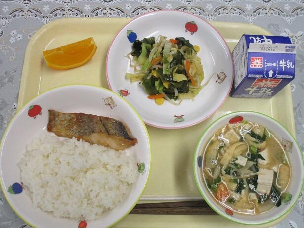 ごはん、鱈の味噌焼き、八宝味噌汁、コーン入りごま酢和え、オレンジ、牛乳