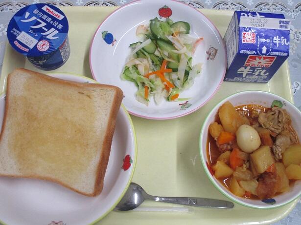 インド煮のスパーシーな香り、さつま揚げ、豚肉、ウズラの卵がとろけそうなジャガイモととても良い味を奏でます。サラダのドレッシングが野菜類を引き締めます。そして、適度な甘さのトーストに笑顔が教室にあふれるのでは?