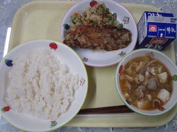 ごはん、鯖の文化干し、だまこ汁、おかか和え、市川の梨、牛乳