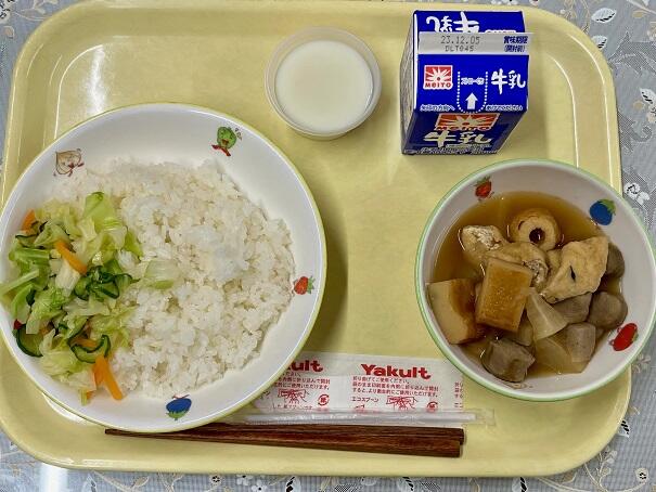ごはん、一口おでん、浅漬け、ミルクプリン、牛乳