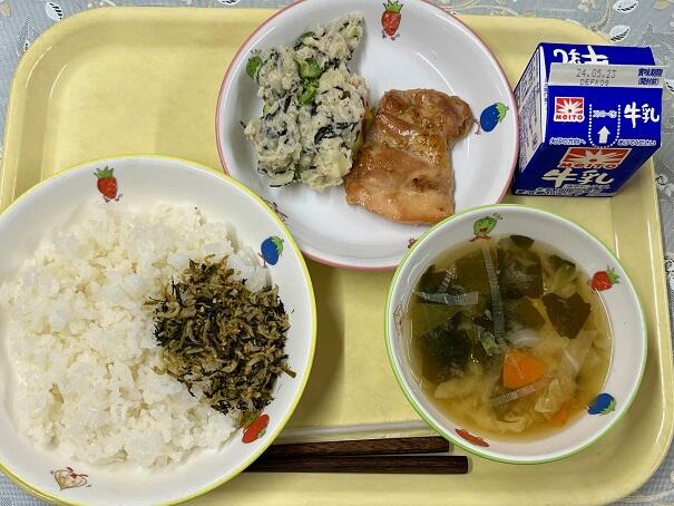 ごはん、小松菜とシラスのふりかけ、鶏香味焼き、ひじポテサラダ、味噌汁、牛乳